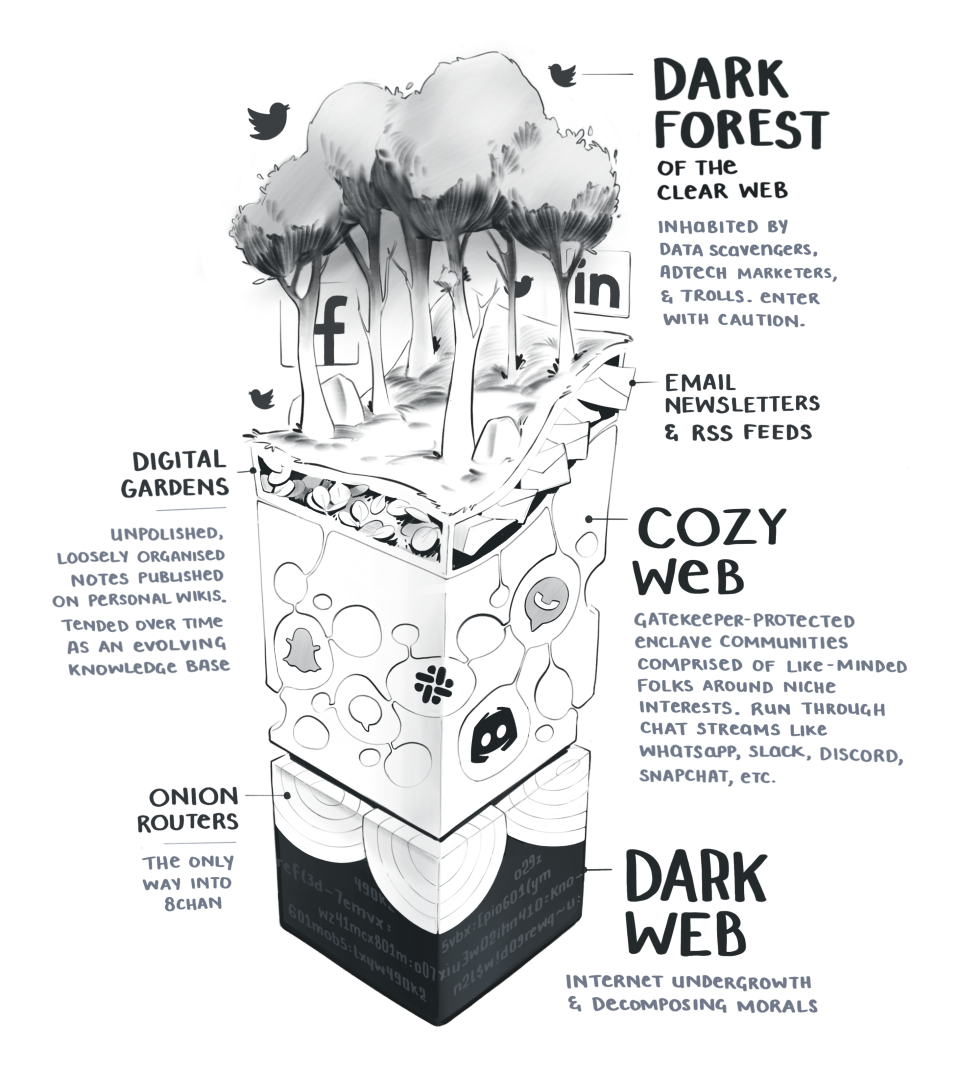 I do not have to outline how enpoopified the web has become. That’s well covered by a real writer. But this diagram in Maggie Appleton’s post, The Dark Forest and the Cozy Web, has lingered as an accurate depiction.